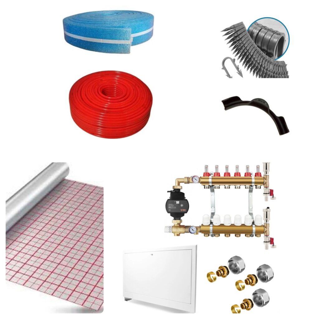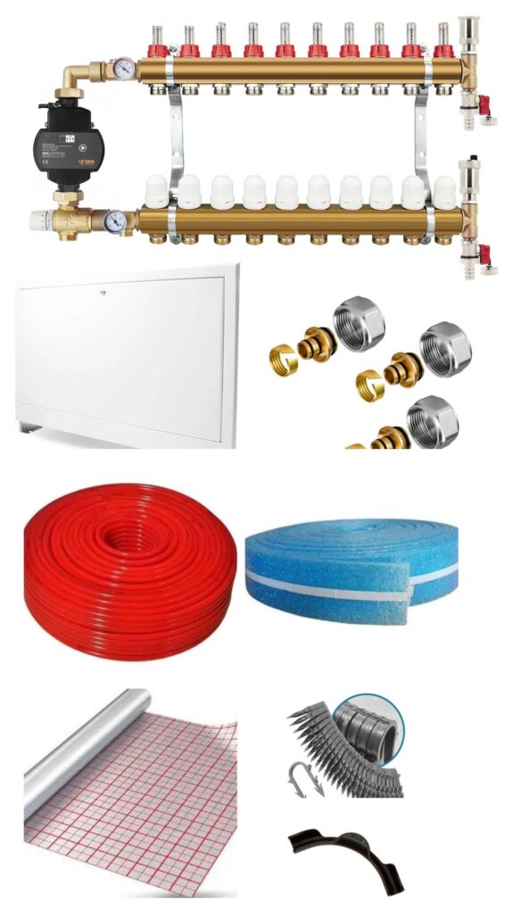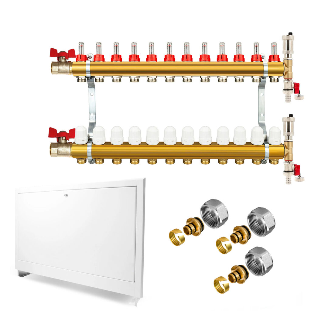 – Distribuitor rectangular  1″ din inox cu debitmetre  0 … 5 l/min pe tur si ventile M30x1,5 pentru oprirea sau reglarea debitului pe retur ( pot fi controlate manual sau automat cu actuatoare electrotermice);